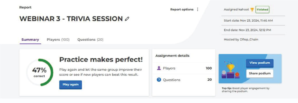 Image: Trivia session with 100 participants and a 47% correct score