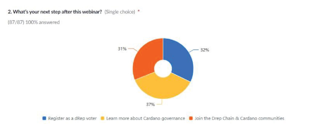 The final webinar was closed out with a second trivia session which was a simulation test for participants who had attended all the DRep Chain webinar series (1-3). The objective was to measure whether participants interested in becoming dReps or voting directly would react during governance action voting. However, out of 120 recorded participants, only 5 submissions were provided for Trivia B.